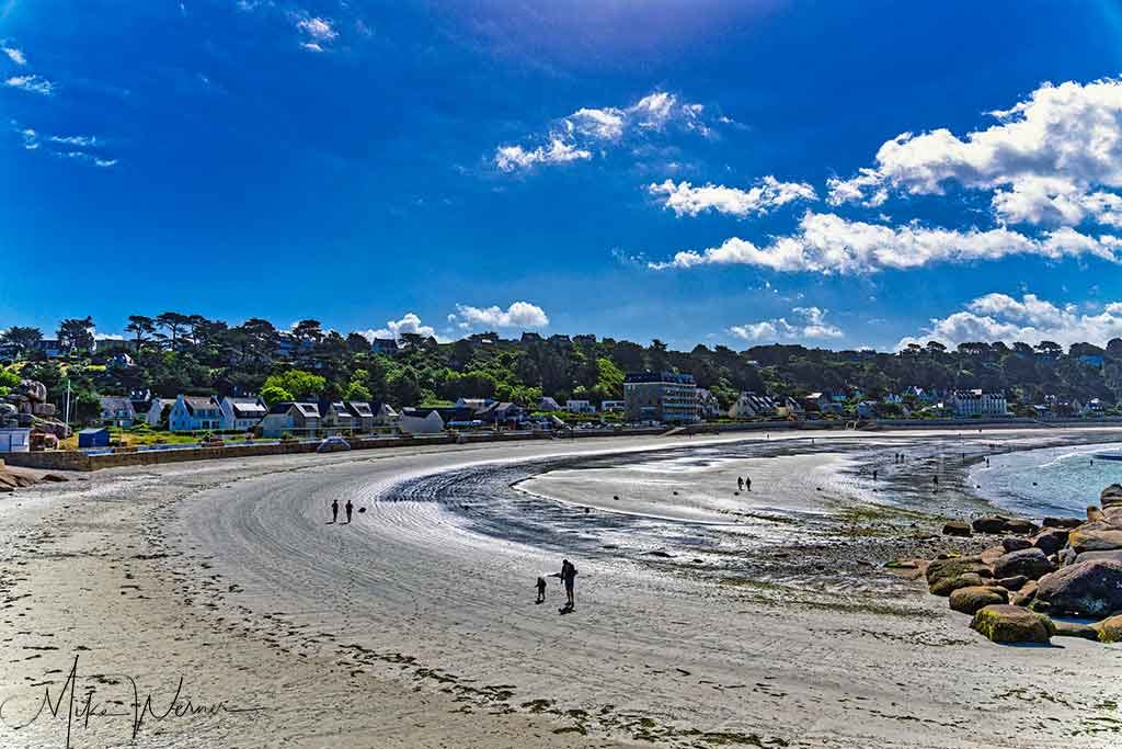 The coastline around Trebeurden is quite varied. There are several beaches, including Tresmeur, which is close to the town centre, and Pors Termen, which is more open to the sea and used for water activities. Between these beaches, the landscape alternates between rocky headlands and small coves. The tidal range is important, and at low tide large areas of seabed are exposed. This allows access on foot to nearby islands such as Ile Milliau, which contains archaeological remains confirming human presence dating back to prehistoric times, including megalithic structures.